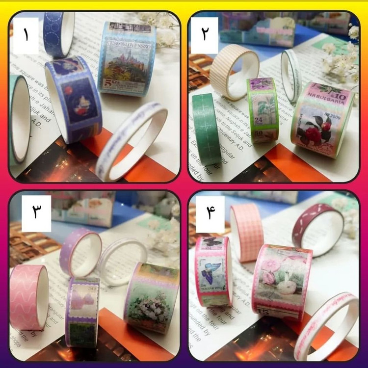 چسب واشی طرح تمبر هر پک در ۴طرح مختلف طول هر رول ۲متر است با عرض های مختلف یک چسب با عرض ۲/۵ سانتی متر دو چسب با عرض ۱/۵ سانتی متر یک چسب با عرض ۱سانتی متر یک چسب با عرض ۰/۵سانتی متر