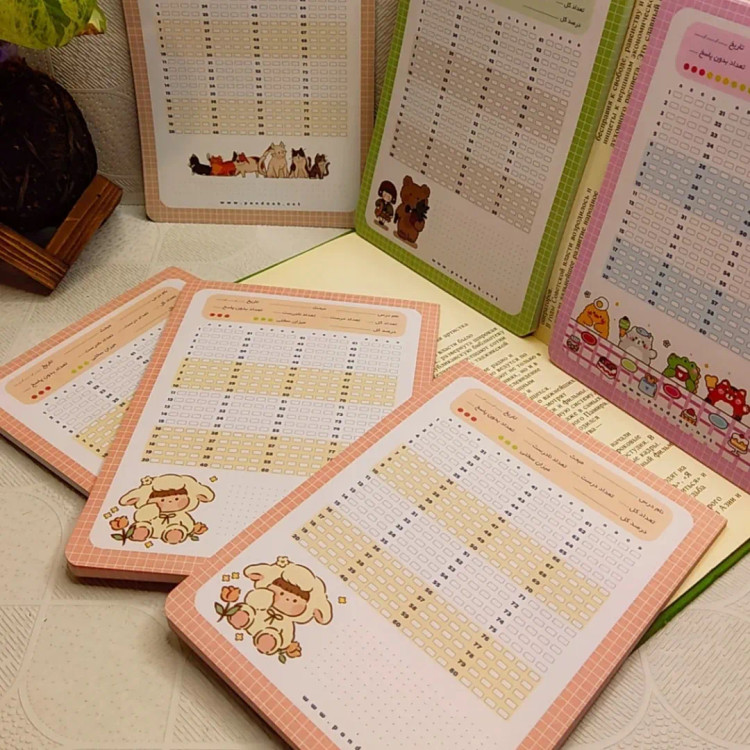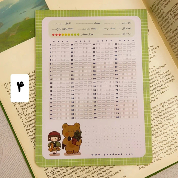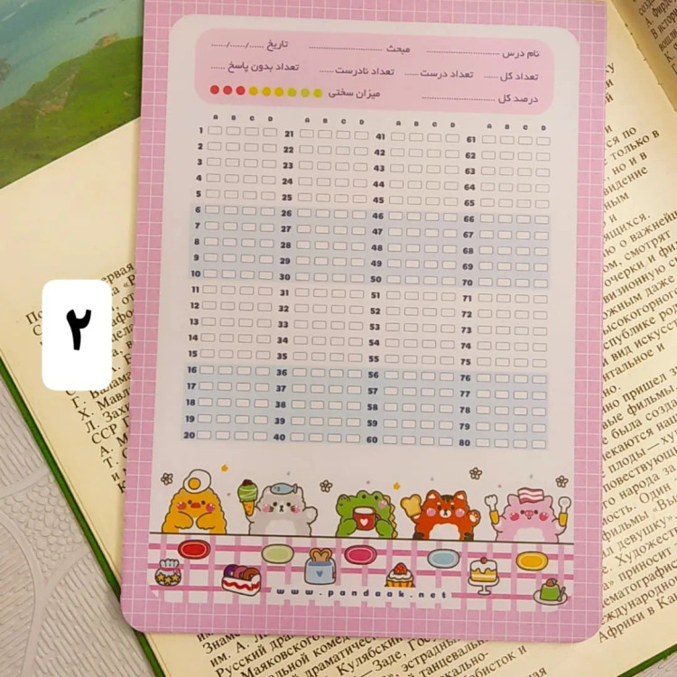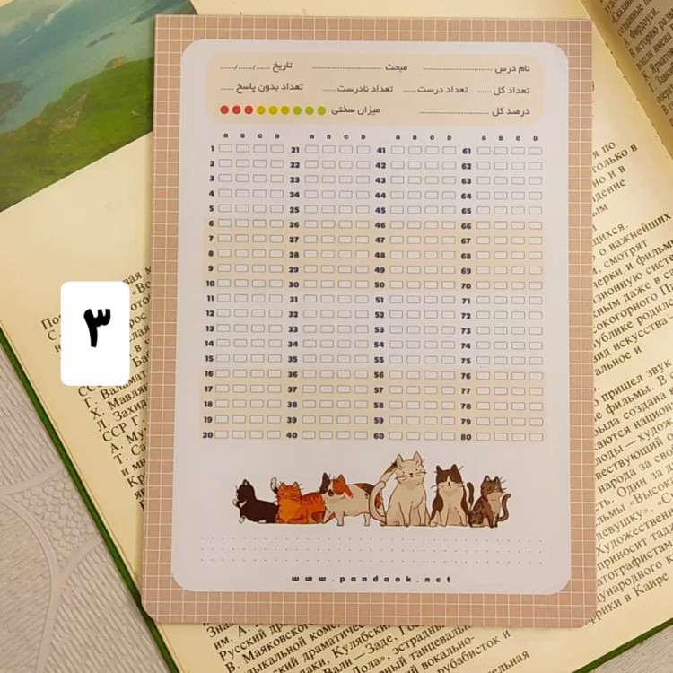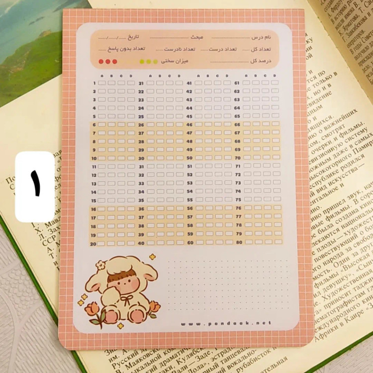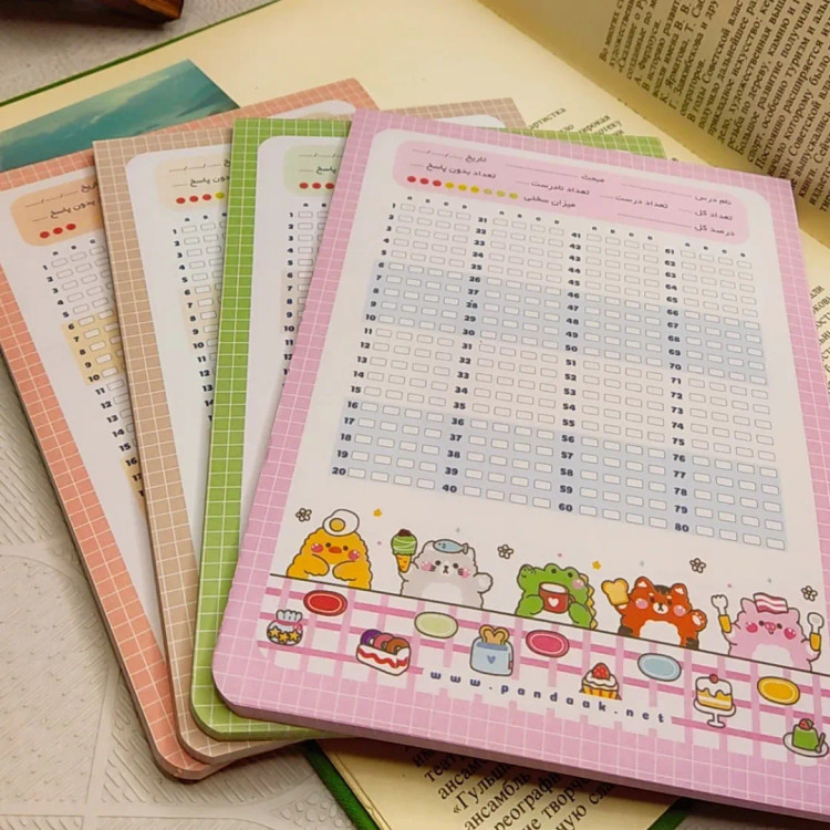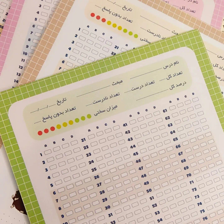 کی گفته تست زدن باید خستهکننده باشه؟ با این پاسخنامههای بانمک و رنگی، تمرینکردن هم میتونه حالخوبکن باشه! خودم که با دیدنشون دلم خواست دوباره درس بخونم. ۴ طرح زیبا داره .هر دفترچه ۵۰ برگ داره. ابعاد ۱۵×۲۰ سانتی متر .هر برگ برای ۸۰ تست طراحی شده. با سربرگی که میتونی کلی اطلاعات بالای برگه ات بنویسی و یه ارزیابی و سنجش کامل از خودت داشته باشی . با اینها قراره درس خوندن رو از یک اجبار خشک، تبدیل کنی به یک تجربهی دلنشین.