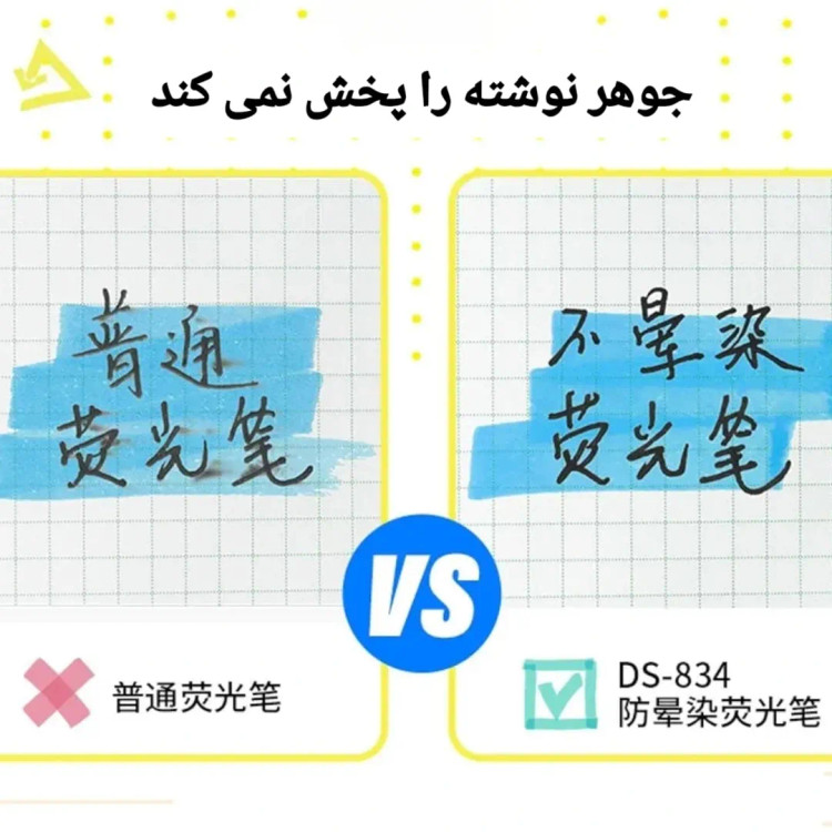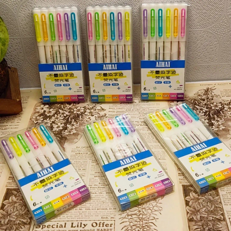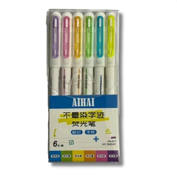 هایلایتر قلمی از برند AIHAI از سری No smear یعنی هایلایتر بدون پخش شدن جوهر.این ویژگی در هایلایتر به این معنی است که جوهر هایلایتر پس از خشک شدن، پخش نمیشود و لکهای ایجاد نمیکند، به خصوص زمانی که روی متنی که با جوهر معمولی نوشته شده است، استفاده شود.این ویژگی تضمین میکند که نوشتههای زیر هایلایت، واضح و خوانا باقی میمانند و جوهر هایلایتر باعث محو شدن یا پخش شدن جوهر اصلی نمیشود. فوق العاده با کیفیت