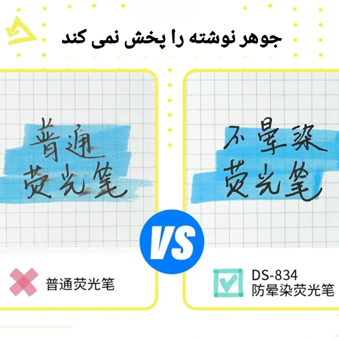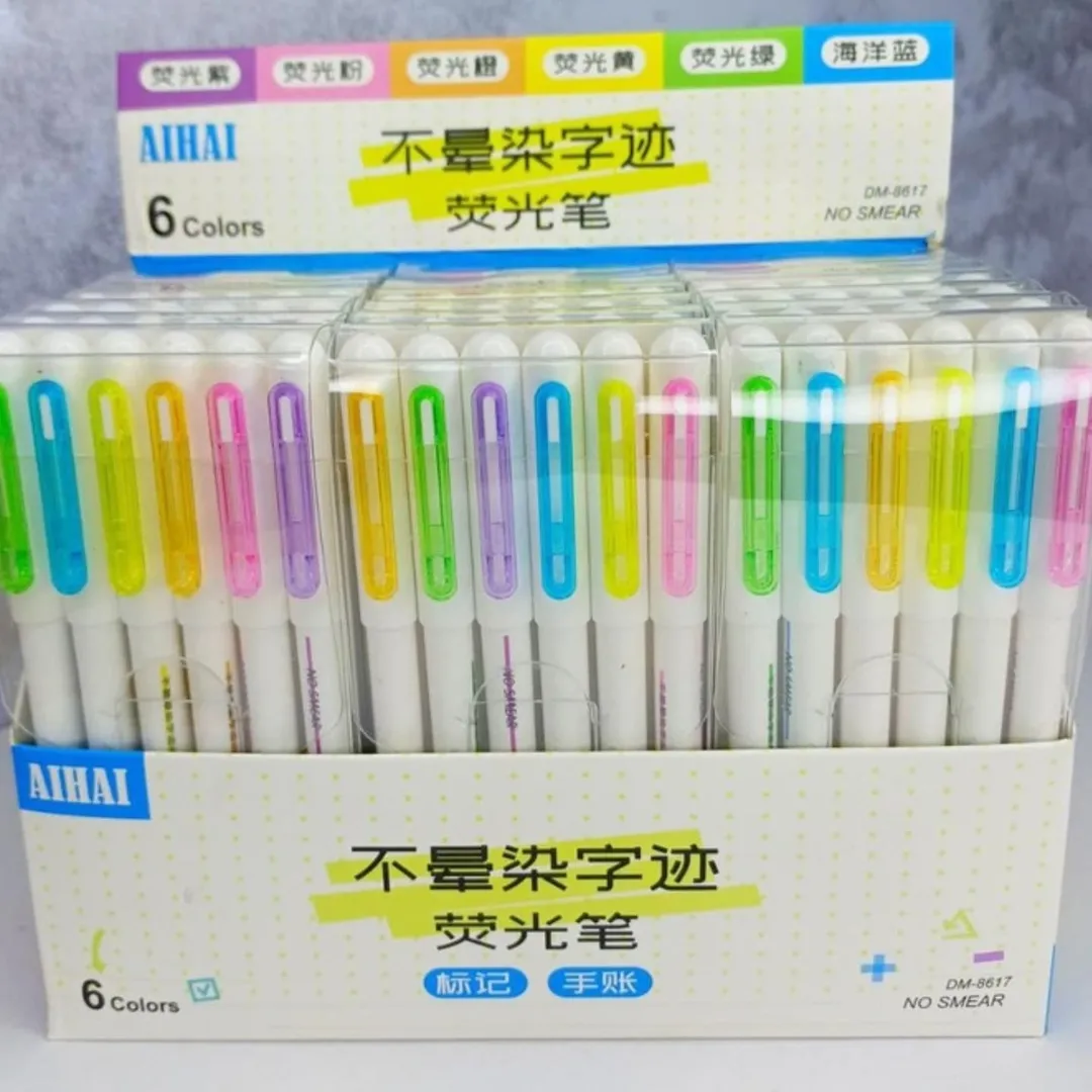 هایلایتر قلمی از برند AIHAI از سری No smear یعنی هایلایتر بدون پخش شدن جوهر.این ویژگی در هایلایتر به این معنی است که جوهر هایلایتر پس از خشک شدن، پخش نمیشود و لکهای ایجاد نمیکند، به خصوص زمانی که روی متنی که با جوهر معمولی نوشته شده است، استفاده شود.این ویژگی تضمین میکند که نوشتههای زیر هایلایت، واضح و خوانا باقی میمانند و جوهر هایلایتر باعث محو شدن یا پخش شدن جوهر اصلی نمیشود. فوق العاده با کیفیت