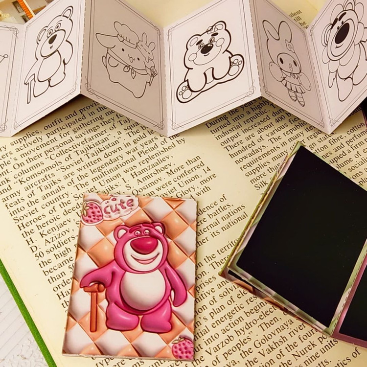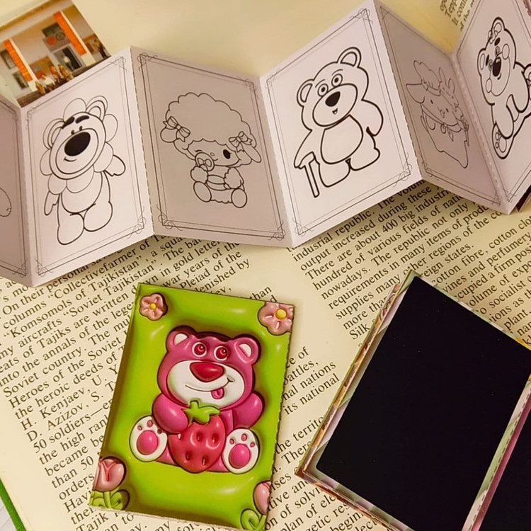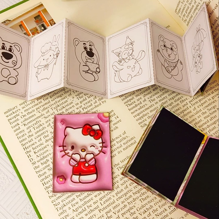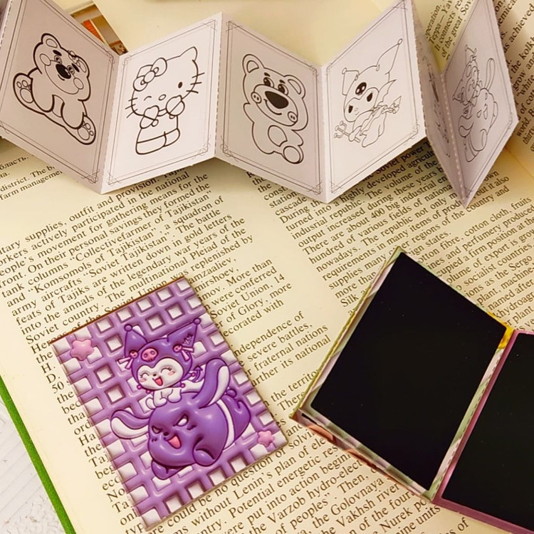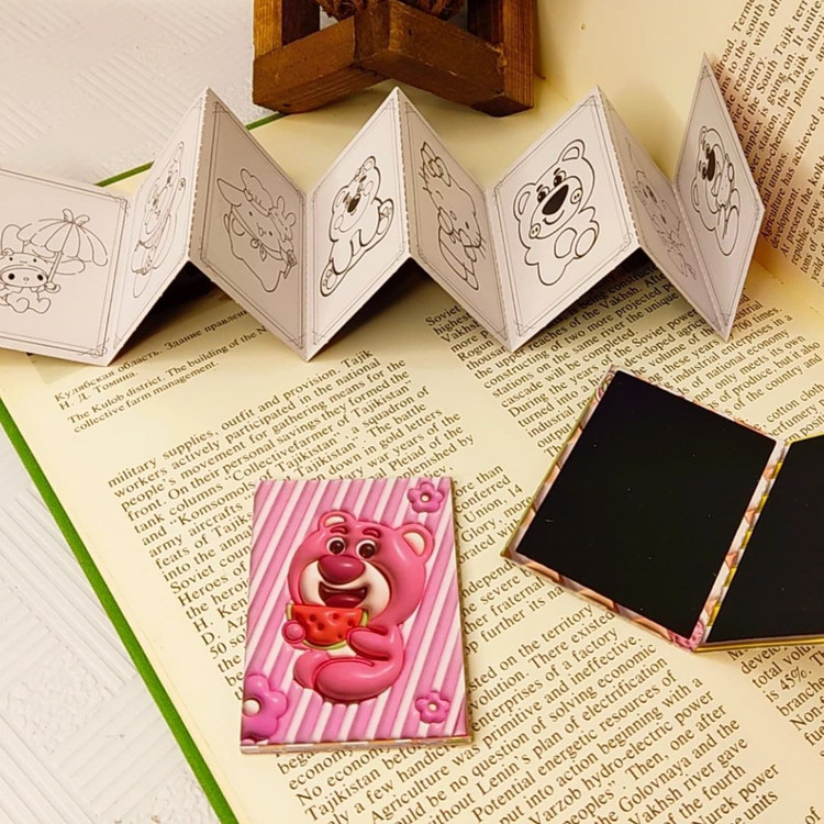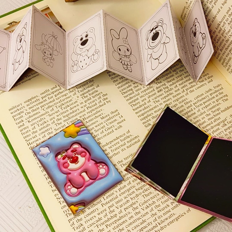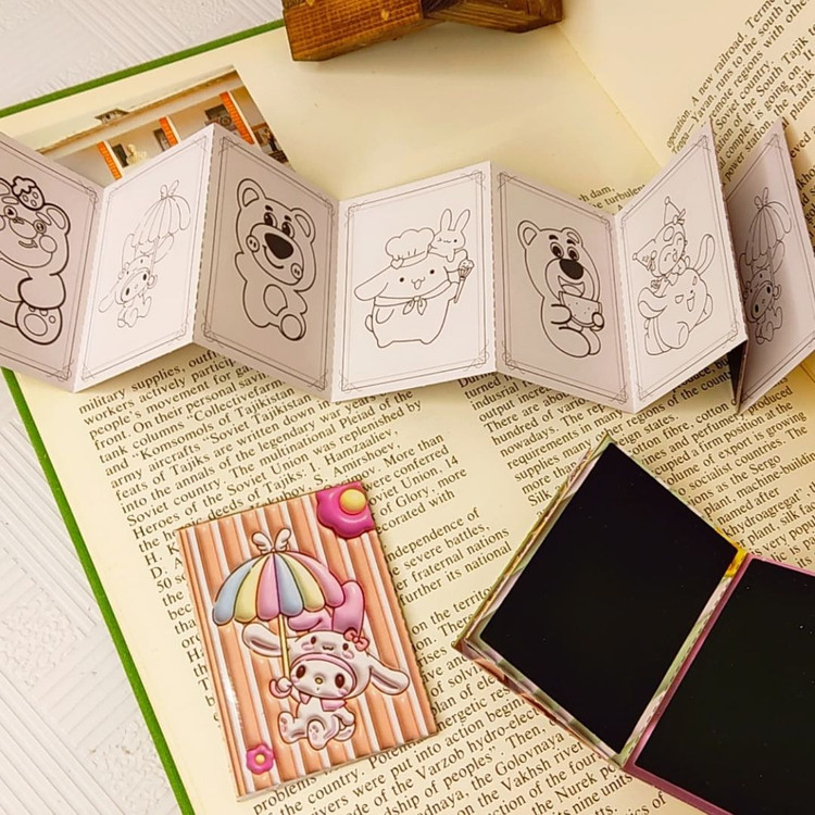 دفترچه رنگ آمیزی+اسکراچ یا برگه زغالی یا جادویی برگه ها به صورت تاشو هستند.یک طرف ۸برگ برای رنگ آمیزی داره و پشت آنها ۷برگ زغالی نقلی هستند ابعاد ۵×۷ سامتی متر
